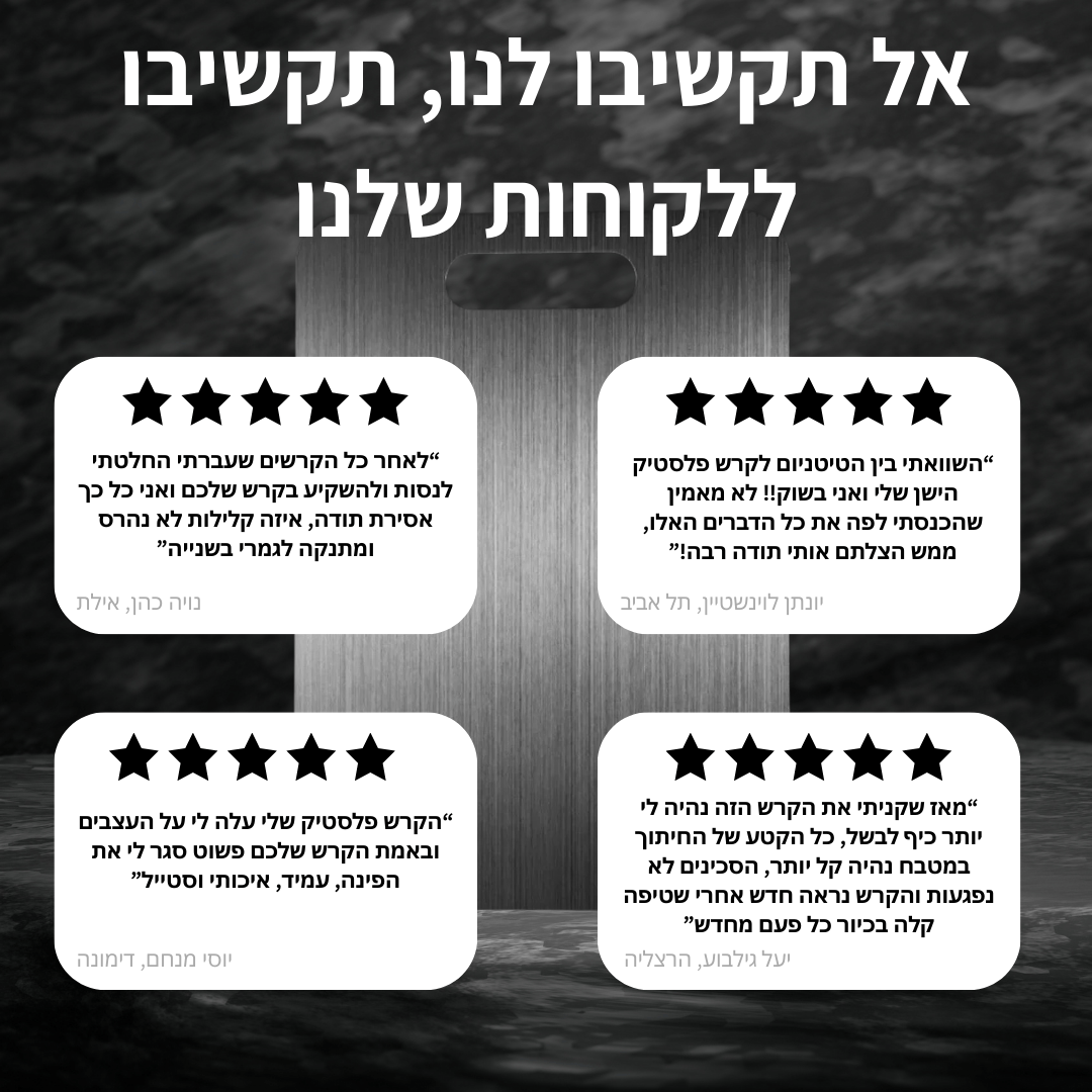אז אם אכפת לכם מהבריאות שלכם ושל המשפחה שלכם, תזרקו את קרש החיתוך שיש לכם בבית והזמינו את קרש החיתוך מטיטניום שלנו.